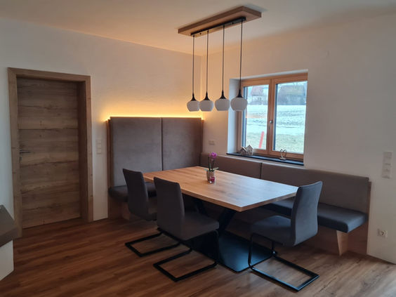 Esszimmer in Dekor Eiche mit massiver Tischplatte aus Eiche & schwarzem Metalltischgestell. Sessel Pallestrang Vollpolster mit Stoff Havanna. Lehnenteile in Stoff Ilias.